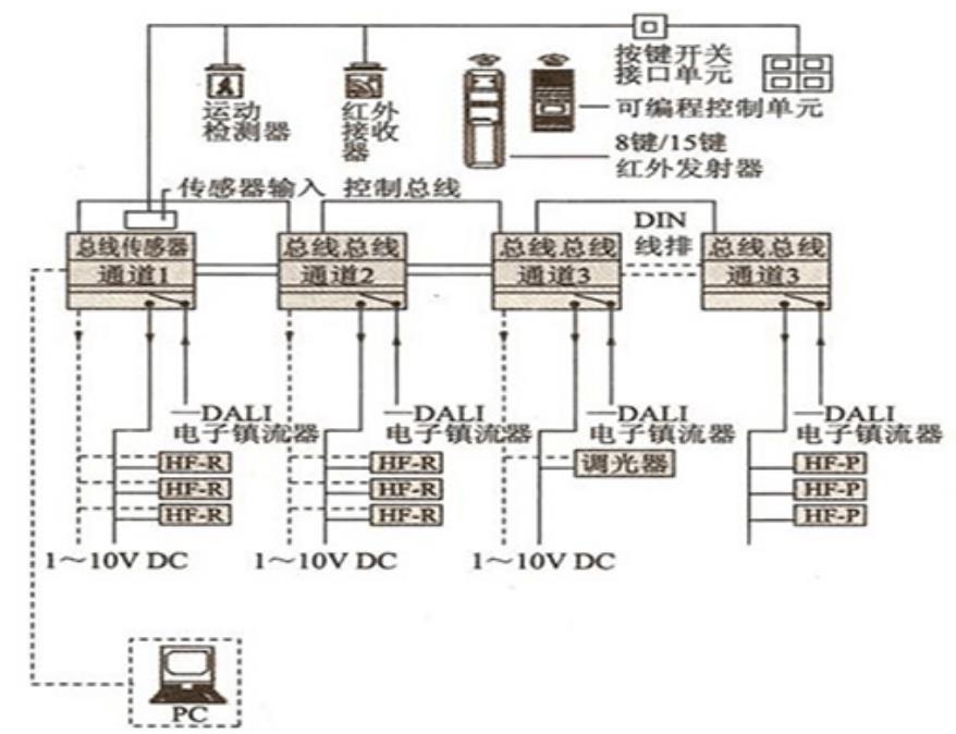 如下DALI系統(tǒng)連接圖所示,DALI的連接硬件包括普通的帶DALI功能的電子鎮(zhèn)流器、燈、控制器和配線,與普通的燈光硬件連接區(qū)別在于,帶DALI接口的器件可以直接連接到計(jì)算機(jī)或主控機(jī),而且每個(gè)DALI器件都是可以自己尋址、編程、分組和場(chǎng)景設(shè)定。 作為一個(gè)數(shù)字照明網(wǎng)絡(luò),它不僅適用于小型控制系統(tǒng),對(duì)于大型的照明系統(tǒng)安裝也是應(yīng)用自如,如以下場(chǎng)合: